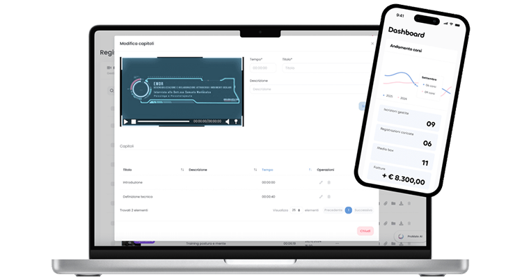 Integrato nel nostro software per la formazione trovi anche un programma per creare video didattici con un’interfaccia molto chiara e semplice da usare anche per chi non ha nessuna esperienza nell’editing.